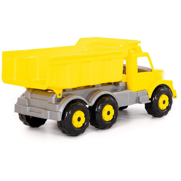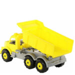 Ez a 73 cm hosszú teherautó élénk sárga színben pompázik. Alváza világos szürke, 3 pár fekete kereke fekete. A kerekek szélesek, vastagok, ettől stabilan gurul a jármű. A vezetőfülke nyitott, a vezető jól láthatja a környezetét. A daruval könnyen le és felemelheted a kisebb játékaidat.