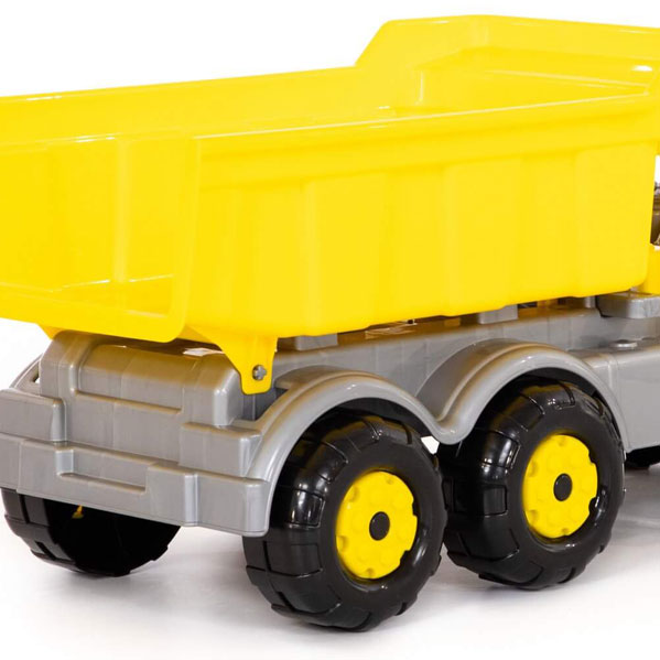 Műanyag játék dömper, mozgatható platóval, nagy, stabil kerekekkel.