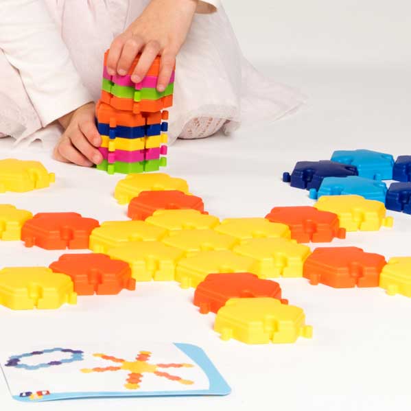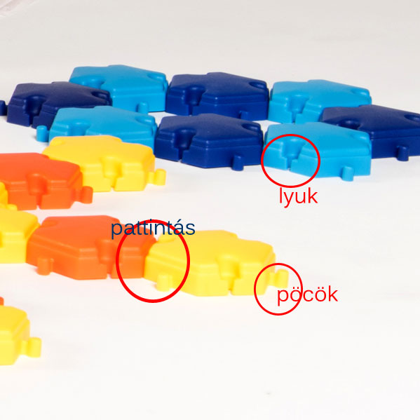 Miután kibontottad a csomagot, összesen 96 darab, különböző színű építő elemet találsz. Lesz benne többféle kék, sárga, zöld, sőt rózsaszín is! Az építőkockák mellett ott lapul 8 darab mintalap, szép alakzatokkal. A kockák formája szokatlan, mert hatszögletű, azaz mindegyiknek 6 oldala van. Próbáld lemérni vonalzóval az oldalak hosszát. Ugye neked is 4 cm jött ki? No és az elem magassága? A te vonalzód is 1 cm-t mutat?