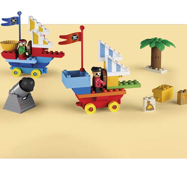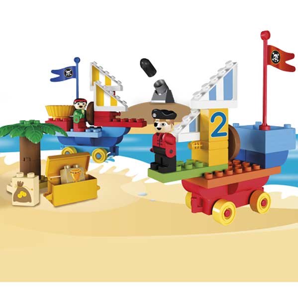 Bizony senki nem örül ha a hajóját a kalózok már a partról észreveszik. A vitorláshajóikat kerekes kocsin vihetik a vízig, az ágyúval messzire tudnak lõni. A kincsesládájuk is készen áll a további elrabolt érték tárolására. Szerencsére a csíkos zászlójuk hamar elárulja õket. A kockákat matricával tudod díszíteni.